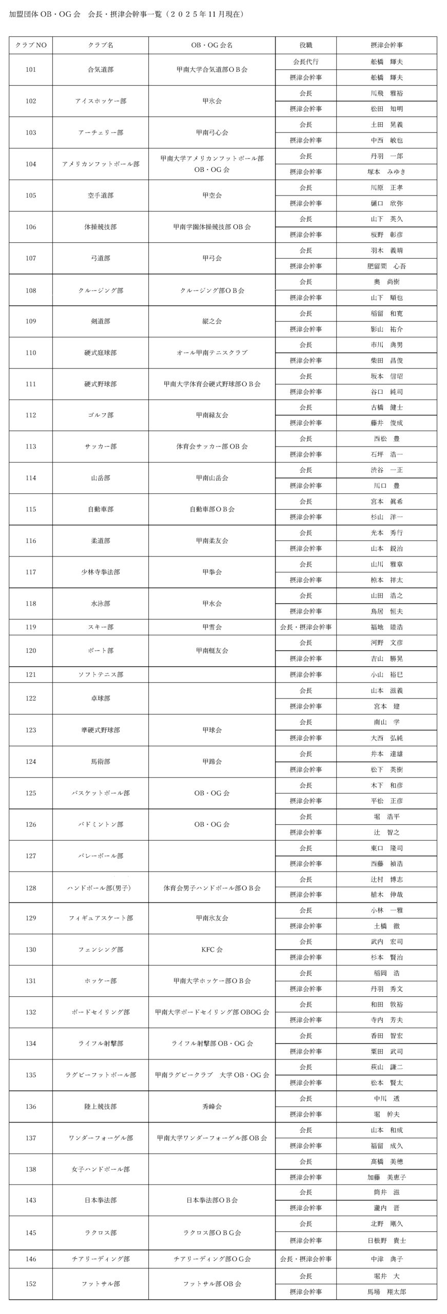 | 135 | ラグビーフットボール部 | 甲南ラグビークラブ 大学OB会 | 会長 | 萩山 謙二 |